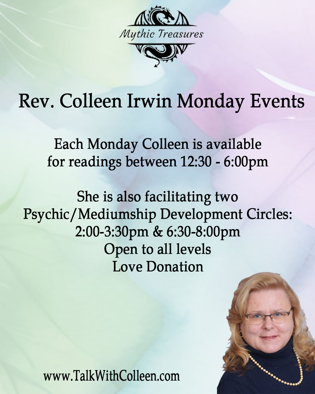 Join Rev. Colleen Irwin for a supportive Mediumship Development Circle designed for all experience levels. Each week, we explore a new topic from her book Guided by Spirit, helping you grow your skills, strengthen your connection with Spirit, and gain confidence in your practice. Bring your copy of the book if you have one (extras available at Mythic Treasures).