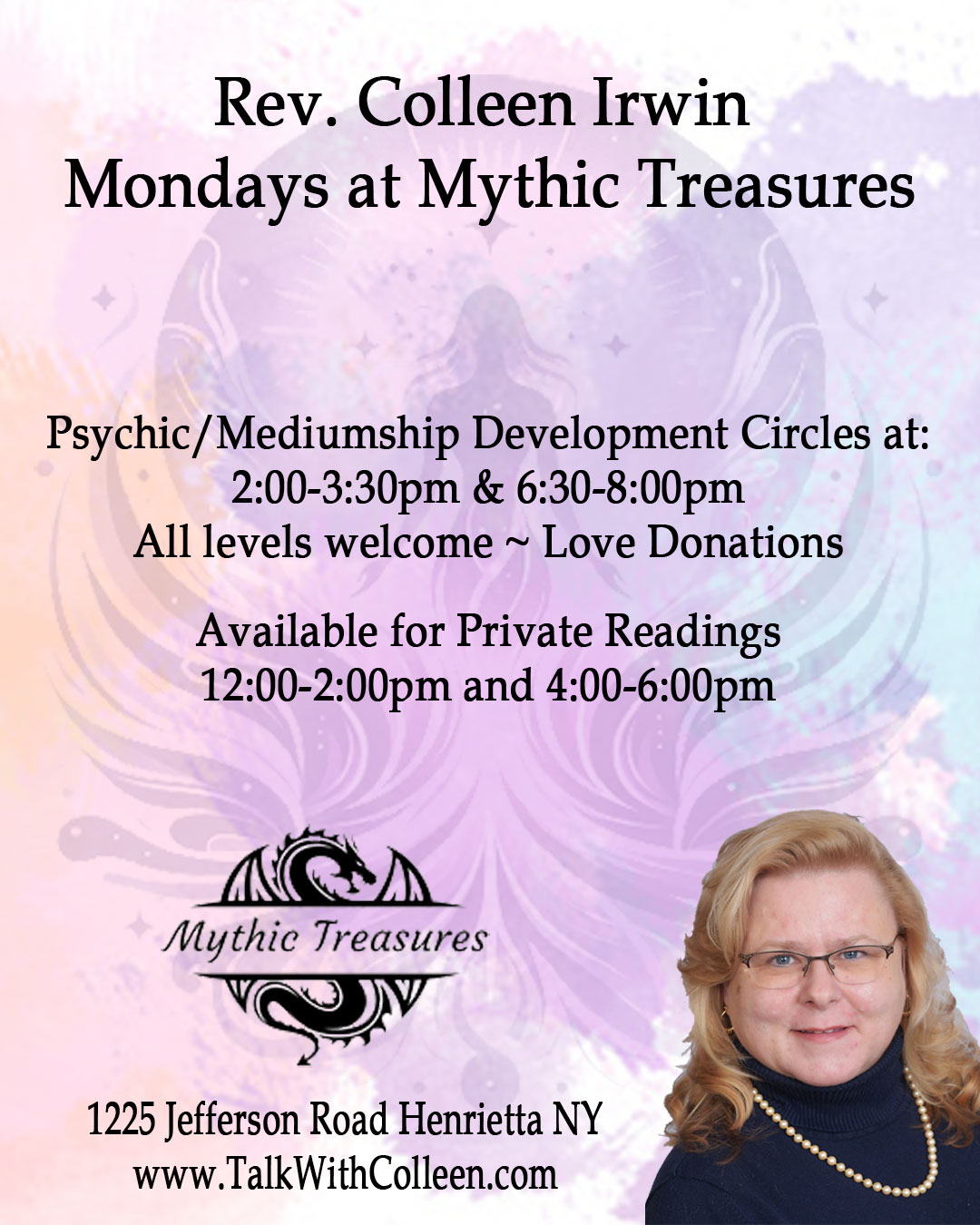 | Join Rev. Colleen Irwin for a supportive Mediumship Development Circle designed for all experience levels. Each week, we explore a new topic from her book Guided by Spirit, helping you grow your skills, strengthen your connection with Spirit, and gain confidence in your practice. Bring your copy of the book if you have one (extras available at Mythic Treasures). | |